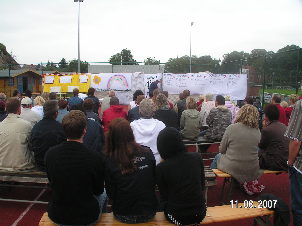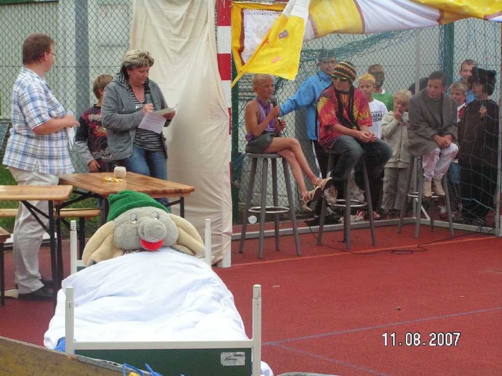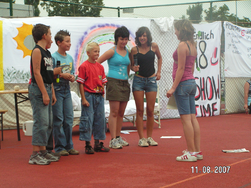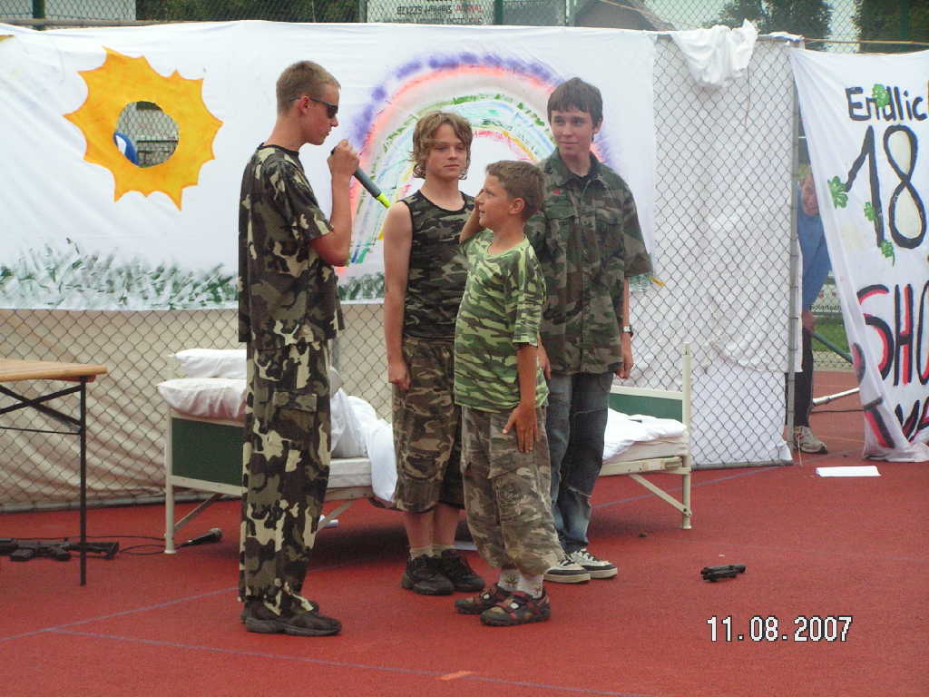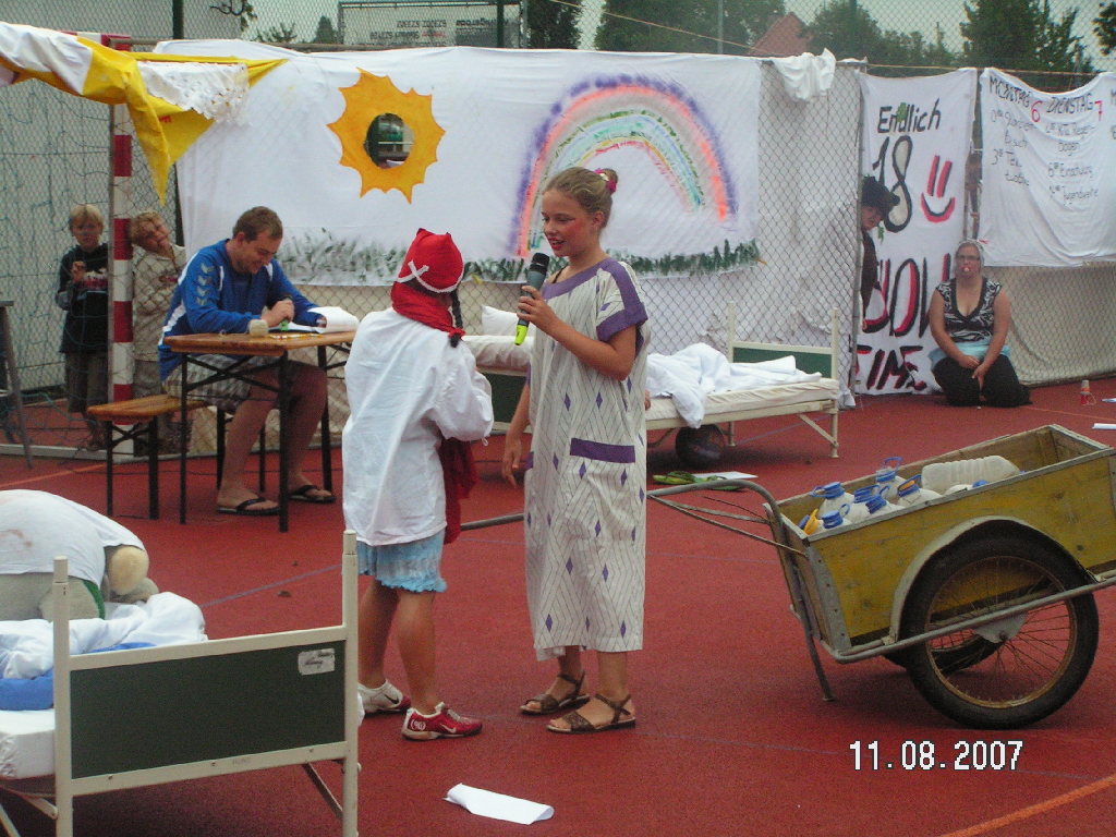 ![]() Neptuntaufe am Albertinesee und bewegender Abschlussabend Auch der zweite Durchgang des Sommercamps in diesem Jahr brachte 60 Kindern eine Woche erlebnisreiche Ferien. Wieder gab es auch viel Spaß im Camp und die Kinder fühlten sich wohl. Der Abschlussabend unter dem Motto "Endlich 18" sollte auf heitere Weise sowohl auf Stationen der kindlichen Entwicklung als auch das 18. Camp im zehnten Jahr hinweisen. Aber es gilt auch einmal die Arbeit der ehrenamtlichen Betreuer zu würdigen. Atzendorf.(Karl Seidel) Die Busfahrt am Mittwoch führte in den Harz zur Western-Stadt Pullmann-City. Die Kinder waren begeistert von der Atmosphäre. Auf der Rückfahrt wurde dann noch beim Abenteuerspielplatz am Concordiasee Halt gemacht. Zweimal fuhren alle mit den Rädern nach Förderstedt zum Albertinesee. Neben Badespaß stand auch die Neptuntaufe auf dem Programm. Der Gott der Meere kam am Freitag mit seinem Gefolge an Land. Die Häscher ergriffen die Täuflinge, seiften sie mit Sahne kräftig ein, rasierten sie, gaben ihnen ein unbeschreibliches Gesöff zu trinken und vertrauten sie schließlich dem kühlen Nass an. Zuletzt gab es noch Taufnamen und Urkunde. Besonderer Höhepunkt mit viel Gelächter und Beifall war die Taufe von Uwe Grenzau auf den Namen "Schnarchender Containerkrebs". Dabei , gaben sich alle Beteiligten besondere Mühe. Aber Uwe nahms gelassen, wechselte seine Kleidung und .bugsierte die ganze Truppe zum Mittagessen. Erbsensuppe mit Würstchen gab es, nicht jedermanns Geschmack. Aber da musste man durch. Bei der Fahrt zum Löderburger See war leider ein Unfall zu verzeichnen. Ein Kind brach sich beim Spielen den Arm, wurde ärztlich versorgt und operiert,. Hoffentlich wird alles wieder gut. Dieses Mal waren die Kinder mutiger. 17 wagten sich an die Wasserskianlage. Auch die Kanutour mit den Booten von Bodetramp wurde nicht ausgelassen, fand allerdings nicht auf der Bode statt. Damit das 18. Sommercamp in Erinnerung bleibt, war Kathrin Döbbel mit ihrem Camcorder überall dabei. Sie dreht einen Film, der zur Weihnachtsfeier uraufgeführt werden soll. Gleichzeitig soll er die Arbeit der Atzendorfer Sportjugend dokumentieren. Hier ,sind wir schon bei den ehrenamtlichen Betreuern, die mit Engagement bei der Sache waren und deren Arbeit hier gewürdigt werden soll. Aber auch die Sportjugend des ehemaligen Kreises Aschersleben-Staßfurt hat das Camp unterstützt und bekommt dafür ein herzliches Dankeschön. Nun bleibt nur noch die Schilderung des Abschlussabends übrig. Der stand unter dem Motto "Endlich 18"- und sollte gleichzeitig auf das 18. Sommercamp hinweisen. Er begann mit der beziehungsreichen Frage: "Wo kommen die Kinder wirklich her ?" Die Antwort gab hier der Klapperstorch. Es folgten die Teletubbies und ein kleiner Tanz, mit denen die Kindheit dargestellt, wurde. Während der Schulzeitwar das erste Klassenfoto ein herausragender Moment. Jugendweihe hieß das nächste Thema. In der "Rede" dazu wurden die Wünsche der Kinder aufgezählt, darunter der aktuelle, dass die Butter nicht teurer mögen werde. Eine Fahrschulstunde, das Vorstellungsgespräch bei Schwiegermutter und die Bundeswehr waren weitere Stationen eines bewegten Jugendlebens. Zum Abschluss wurde eine kleine Märchenstunde - sehr frei nach "Rotkäppchen" - präsentiert. Es war auf jeden Fall ein unterhaltsamer Rückblick, bei dem die Darsteller vor Lachen manchmal selbst nicht weiter kamen. Prasselnder Beifall der Zuschauer war der verdiente Lohn. Bevor es ans Abschiednehmen ging, wurden noch Justin Lepka - Beste im Laserschießen - und die fleißigsten Teilnehmer am Frühsport geehrt. Uwe Grenzau bekam von jedem der 60 Kinder ein Eis geschenkt und wurde vom Vorstand aus Anlass des zehnjährigen Bestehens des Atzendorfer Sommerlagers mit einer Flasche Sekt und einer Geburtstagstorte für sein tolles Engagement geehrt. Mit einem Tanz aller Teilnehmer und einem Gruppenbild von Kindern und Betreuern endete dieser Abschlussabend, der bestimmt noch lange in der Erinnerung der Teilnehmer bleiben wird. Alle freuen sich schon auf das 19. und 20. Sommercamp im nächsten Jahr. |
